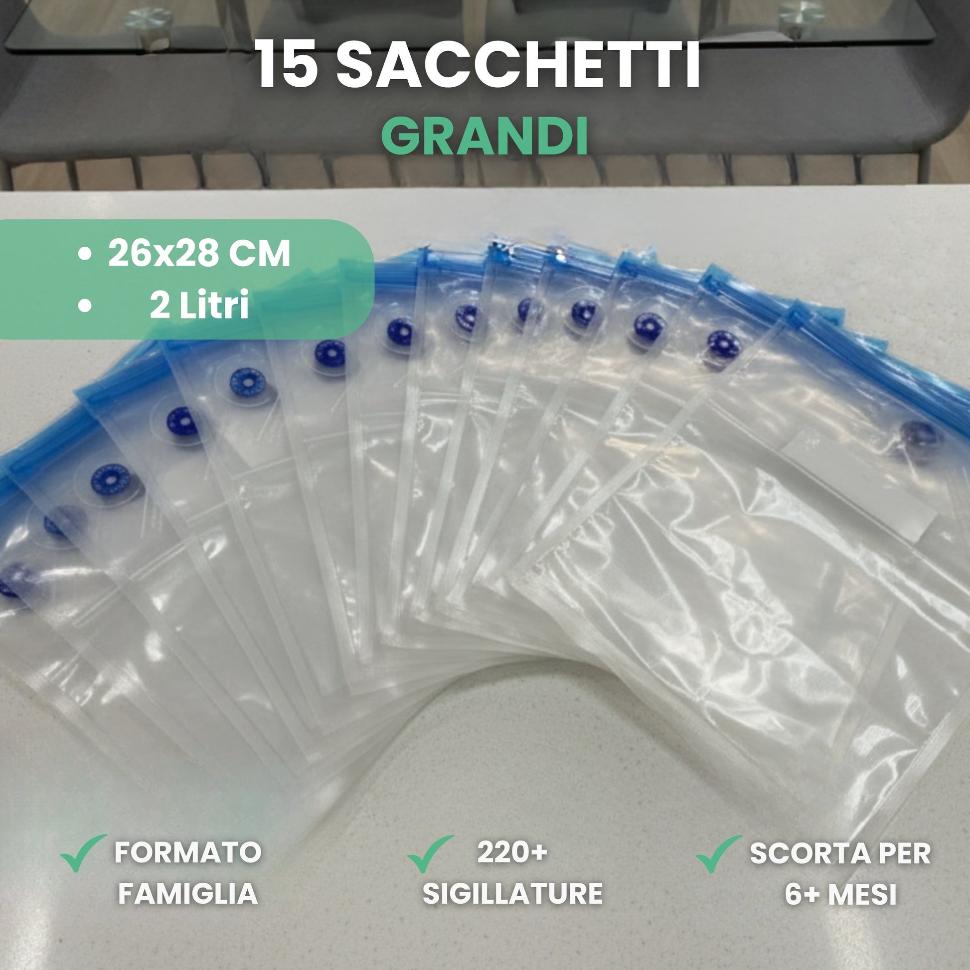 Ogni sacchetto dura 12-15+ cicli di apertura e sigillatura.